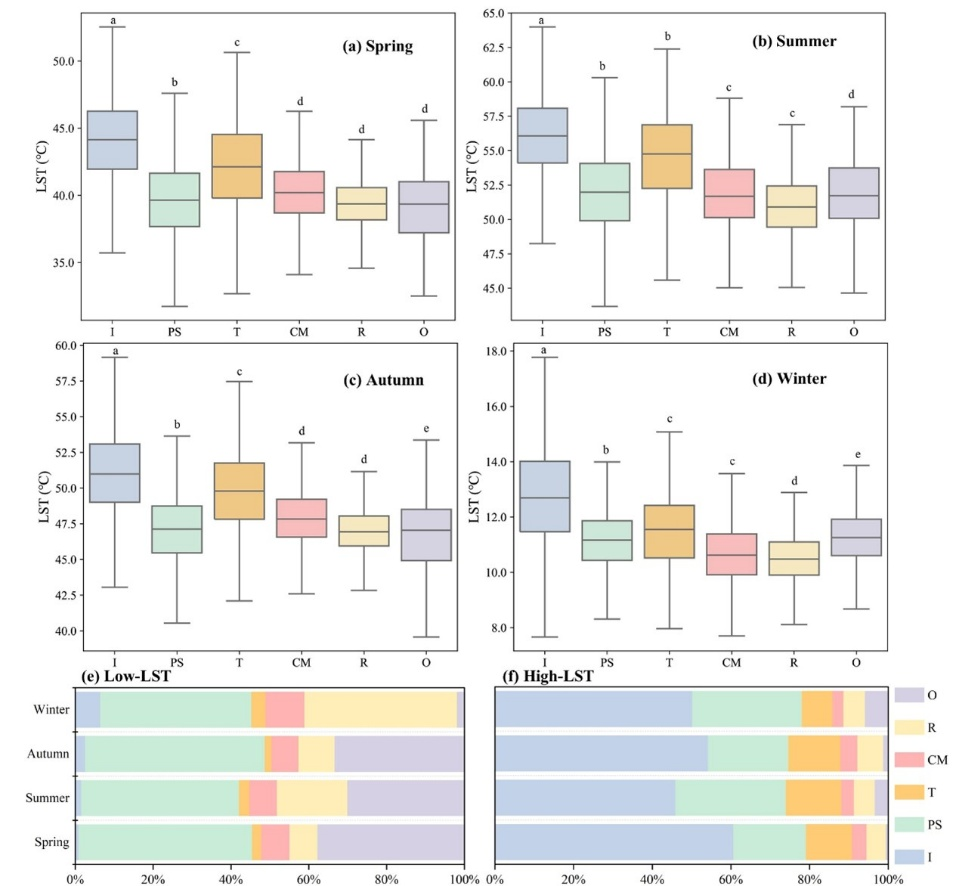 Figure. 5 (a)-(d) Boxplots of LST across UFZs demonstrate statistically significant differences in LST at P < 0.05, as denoted by different letters (a–e); (e)–(f) Bar charts showing the percentage of Low-LST and High-LST areas across different functional zone types.