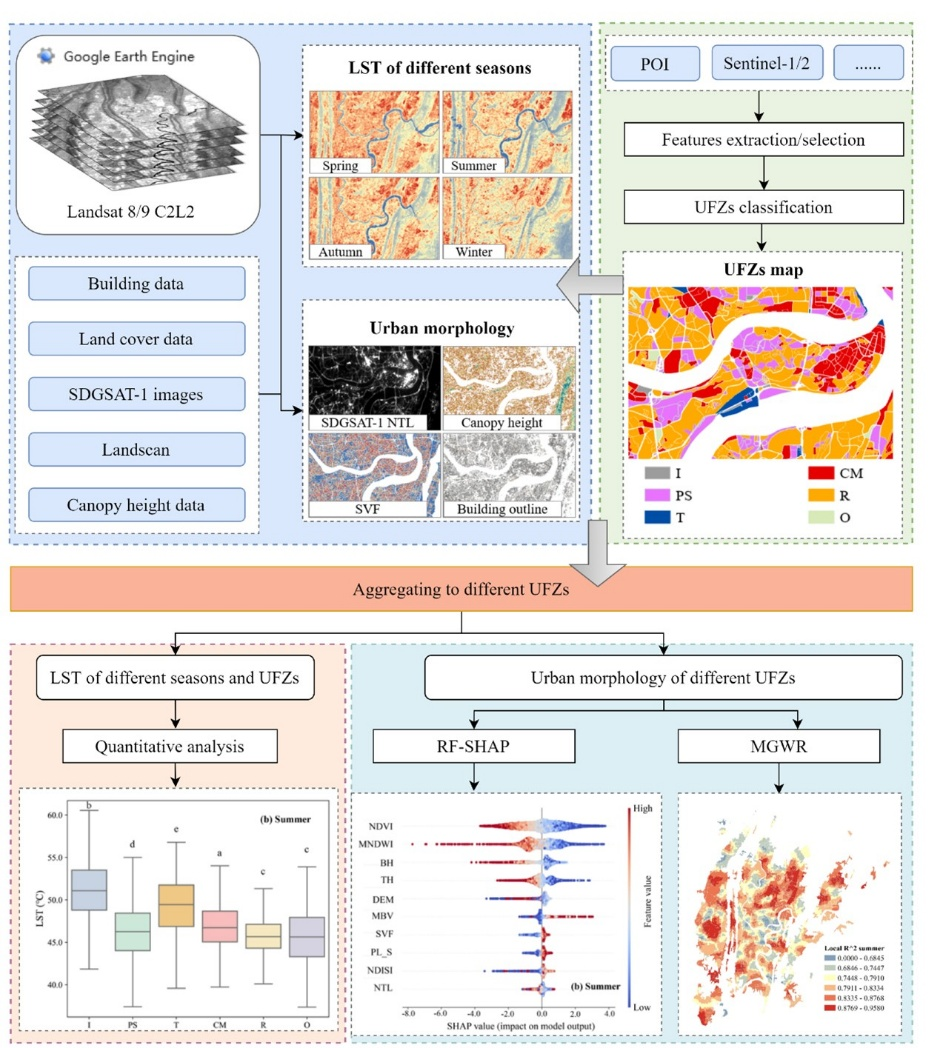 此工作以“Investigating the Influence of Urban Morphology on Seasonal Thermal Environment Based on Urban Functional Zones”为题,于2025年10月24日在线发表于Land。工程中心硕士生曾美玲为第一作者,李月臣教授为通讯作者,重庆师范大学刘春霞教授和重庆市规划设计研究院的何波正高级工程师等多名相关研究人员为合作作者。