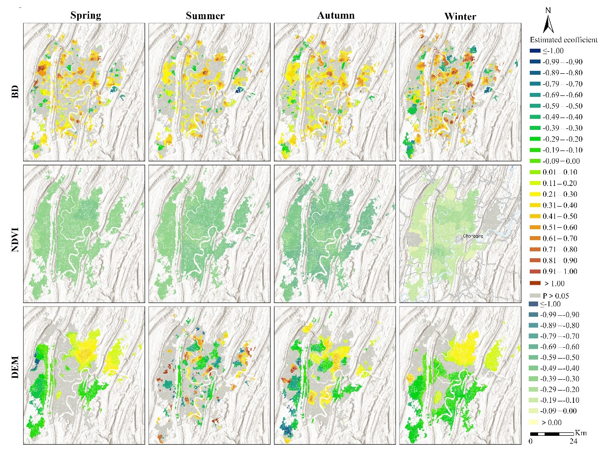 Fig. 9 Spatial distribution of the estimated coefficients of local variables for LST.