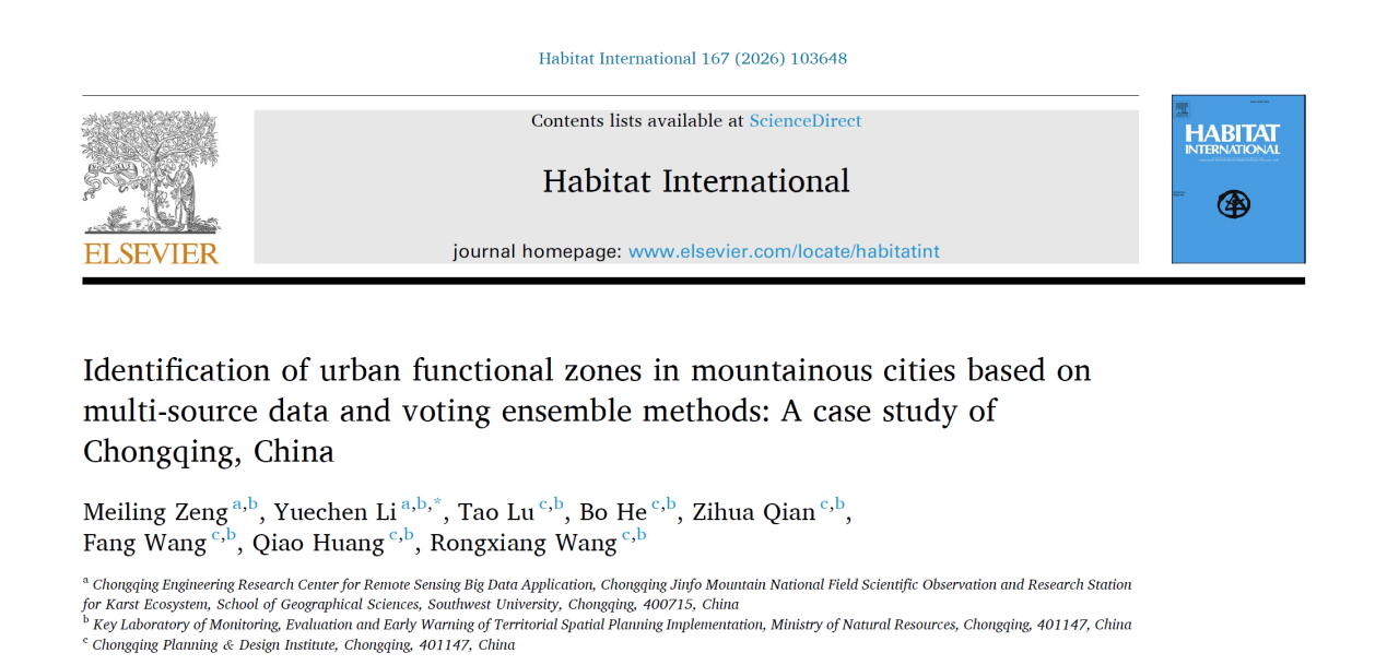此工作以“Identification of Urban Functional Zones in Mountainous Cities Based on Multi-Source Data and Voting Ensemble Methods: A Case Study of Chongqing, China”为题,于2025年11月6日在线发表于Habitat International。工程中心硕士生曾美玲为第一作者,李月臣教授为通讯作者,重庆市规划设计研究院的何波正高级工程师等多名相关研究人员为合作作者。