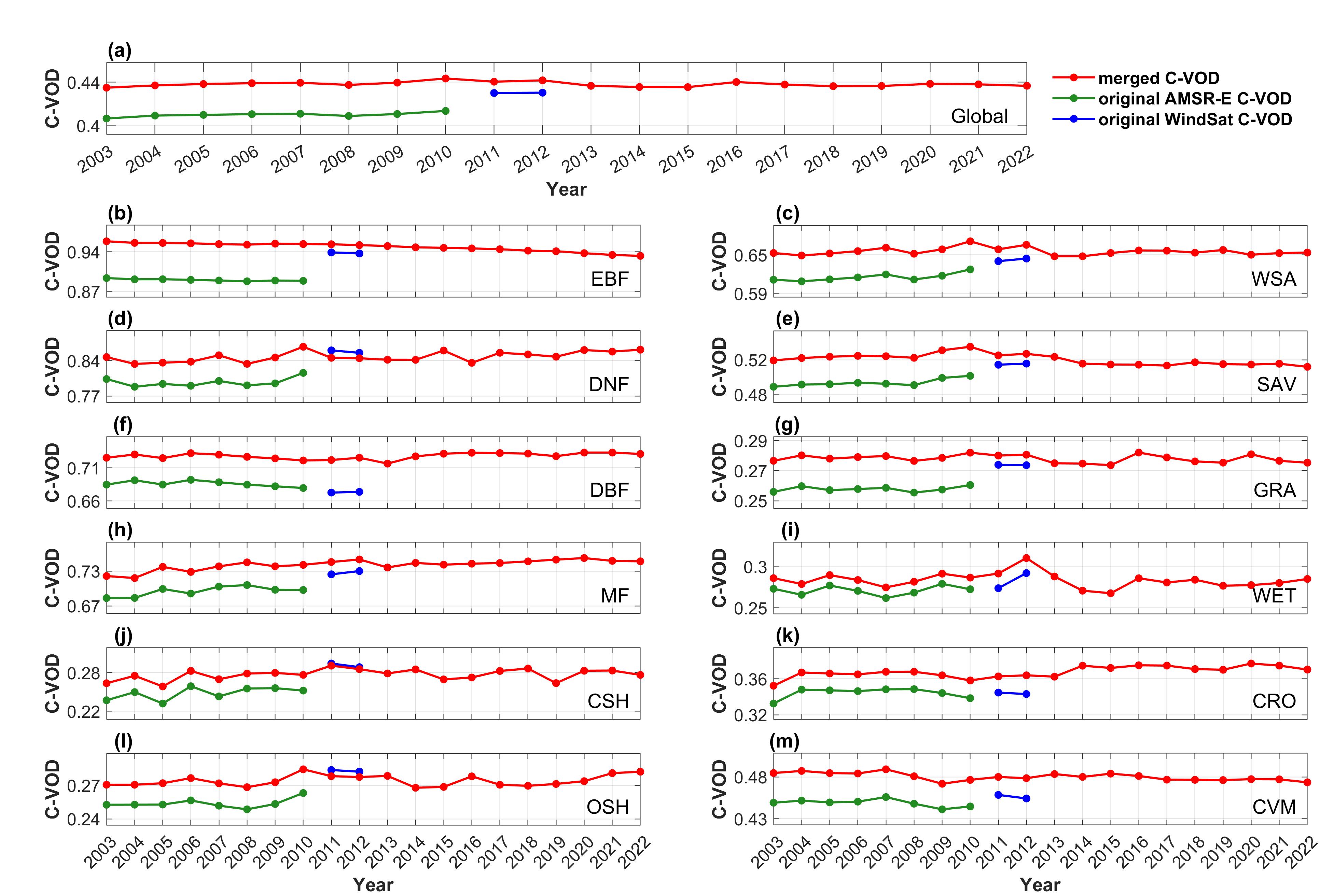 针对上述问题,研究提出了TB的组合校准方法:在稀疏植被区采用线性回归(Linear regression),在密集植被区采用线性放缩(Linear rescaling)。基于此方法,并结合王梦佳副教授开发的C-band Microwave Emission of the Biosphere(C-MEB)模型,反演获得了长时序合并C-VOD数据集。研究结果显示,合并后的C-VOD在跨传感器长期一致性方面显著提升(图1)。在全球大多数植被类型中,合并C-VOD的精度明显优于其他国际长时序C-VOD产品(如VODCA C-VOD),其中在全球54.44%的区域表现出更优的时间性能(图2)。